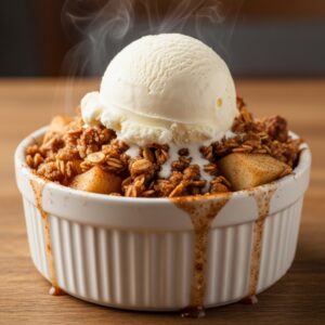 Warm, cozy dessert topped with buttery oats and cinnamon.