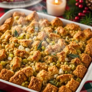 A savory blend of bread cubes, onions, celery, and herbs baked until golden and fragrant.