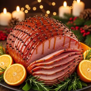 Juicy baked ham coated in a sweet and sticky honey glaze, perfect for guests who prefer ham over turkey.