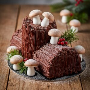 A festive chocolate sponge cake rolled with cream filling and decorated like a wooden log.
