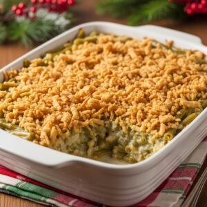 A beloved holiday casserole combining green beans, mushroom soup, and crispy onions.