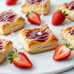 Puff pastry squares filled with strawberry jam and topped with icing.