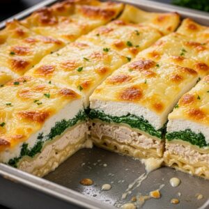 A layered bake filled with spinach, ricotta, and tender chicken.