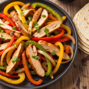 Colorful, zesty chicken cooked with peppers and onions.