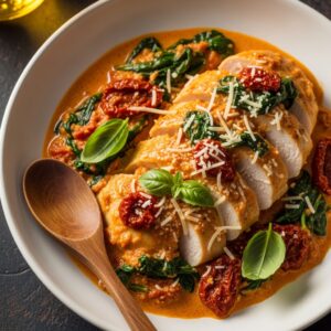 Creamy sauce with sun-dried tomatoes and spinach.