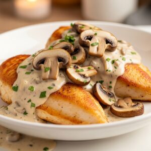 Tender chicken in a rich, creamy mushroom sauce.