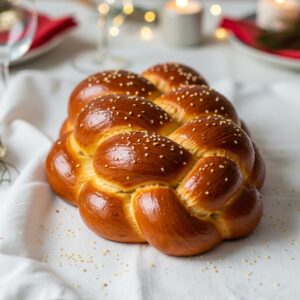 Sweet, braided Jewish bread with a glossy golden crust.