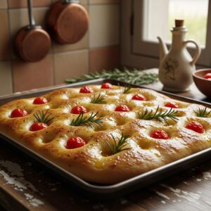 Chewy, olive oil–rich Italian bread topped with herbs — ideal as an appetizer.