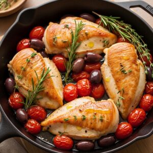 A one-pan dinner with olives, tomatoes, and Mediterranean flavors.