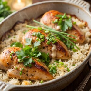 Comforting one-pan dinner — tender chicken baked with flavorful rice.