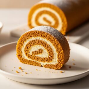A spiced pumpkin sponge cake rolled with creamy filling.