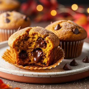 Moist pumpkin muffins with melty chocolate chips throughout.