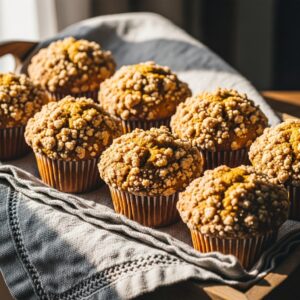 Moist pumpkin muffins topped with a buttery cinnamon crumble.