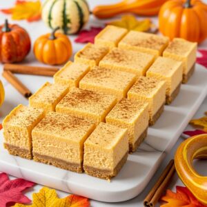 Creamy pumpkin cheesecake baked as bars for easy serving.