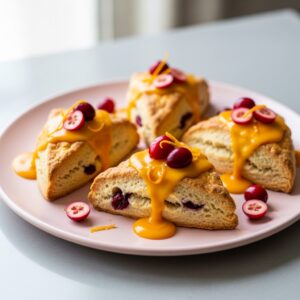 Tender scones studded with cranberries and lightly glazed with orange icing.