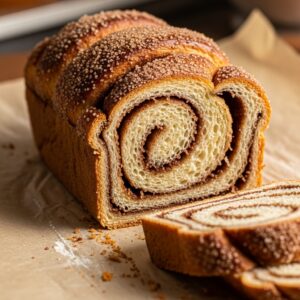 A tender zucchini loaf with a sugary cinnamon swirl throughout.