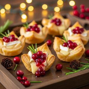 Puff pastry cups filled with brie and cranberry sauce – sweet and savory.