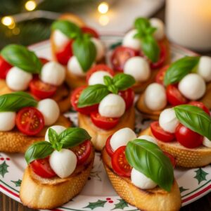 Festive tomato, basil, and mozzarella on toasted baguette slices.
