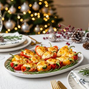 Mix cheeses and chives, fill peppers, and bake 12–15 minutes.