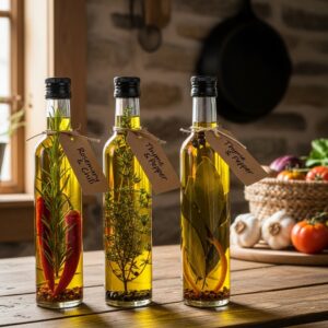 Instructions: Warm olive oil gently with chosen flavorings to infuse. Cool fully, strain if needed, and pour into glass bottles.