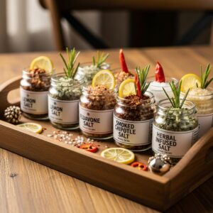 Instructions: Mix salt with herbs or spices, spread to dry, then fill mini jars. Offer a variety like lemon, smoked, and herb salt.