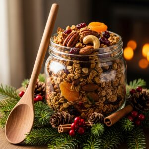 Instructions: Mix all ingredients except dried fruit, bake until golden, then stir in fruit once cooled. Pack in jars.