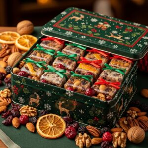 Instructions: Mix batter with soaked fruit and nuts, bake in mini pans, cool, and wrap individually or place in festive tins.