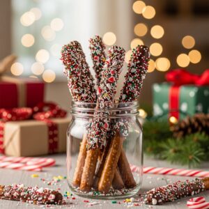 Ingredients: Pretzel rods, chocolate, sprinkles, crushed candy canes.