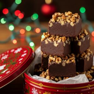 Instructions: Melt chocolate with condensed milk and butter. Stir in vanilla and nuts, pour into a pan, chill, cut into squares, and package in holiday tins.