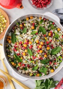 Fluffy basmati rice cooked with toasted almonds, caramelized onions, and pomegranate arils makes a beautiful side dish.