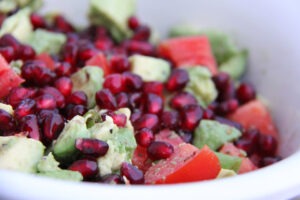 A colorful twist on classic salsa! Combine diced avocado, red onion, jalapeño, cilantro, lime juice, and pomegranate seeds.