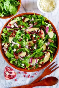 A refreshing salad of baby spinach, feta cheese, candied pecans, and pomegranate seeds, all tossed in a light balsamic vinaigrette.