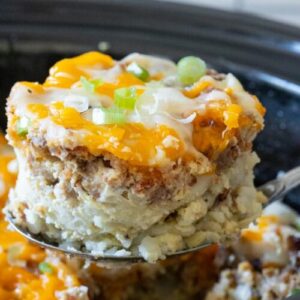 This breakfast casserole combines buttons, eggs, cheese, and sausage in the crockpot for a hearty morning meal.
