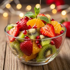 Drizzle with honey-lime dressing and serve in a clear glass bowl so the vibrant Christmas colors shine through.