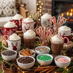 Offer rich hot cocoa, whipped cream, marshmallows, candy canes, and chocolate shavings.