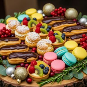 Add cream puffs, mini eclairs, fruit tarts, macarons, and croissants.
