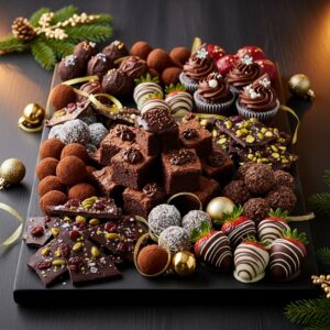 For chocolate enthusiasts, build a board full of rich, decadent treats—brownies, chocolate truffles, chocolate-covered pretzels, mini cupcakes, and dark chocolate bark.