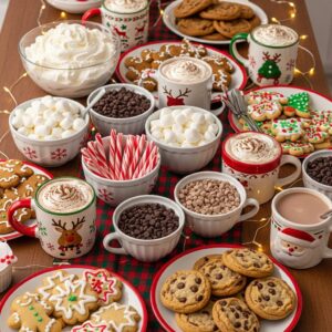 Arrange mugs of hot chocolate surrounded by toppings like mini marshmallows, whipped cream, chocolate shavings, peppermint sticks, and cookies.