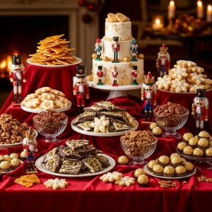 Inspired by the holiday ballet, create a sophisticated dessert spread with spiced nuts, toffee, chocolate bark, and shortbread cookies.