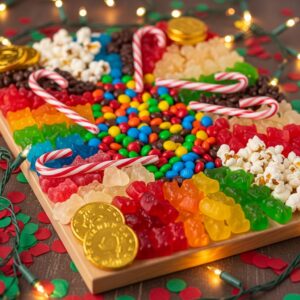 Kids (and adults) will love this colorful board filled with holiday candies—gummy bears, M&Ms, jelly beans, candy canes, and chocolate coins.