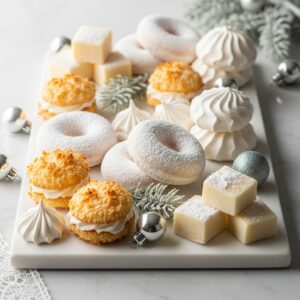 Create an elegant all-white theme with white chocolate bark, coconut macaroons, vanilla fudge, meringue cookies, and powdered sugar donuts.