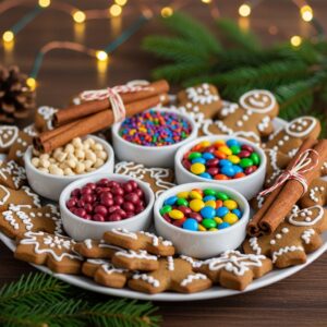 Fill your platter with gingerbread men, houses, and stars, along with small bowls of icing, sprinkles, and candy pieces for decorating.