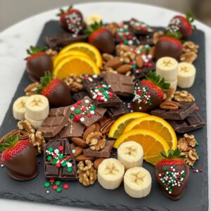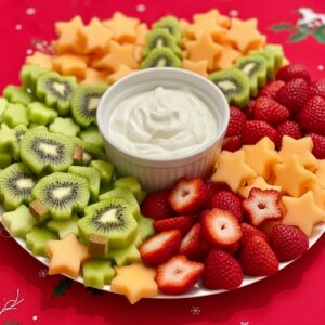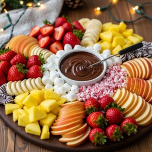 Include fruits like strawberries, bananas, pineapple, and apples. Sprinkle with crushed peppermint for a holiday touch.