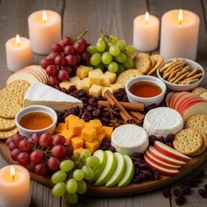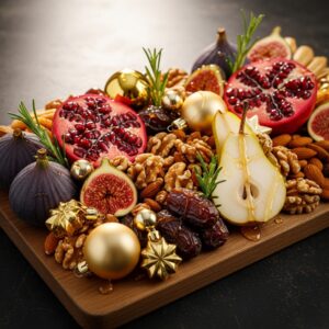 For a sophisticated twist, create a fruit and nut platter with figs, pomegranate halves, pears, dates, almonds, and walnuts.