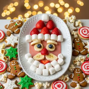 Create a Santa face using strawberries, banana slices, and mini marshmallows for his beard.