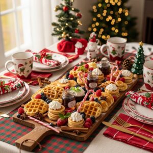 Perfect for Christmas morning, include mini pancakes, waffles, berries, whipped cream, and syrup.