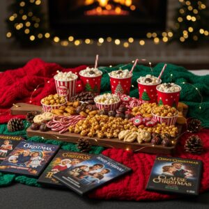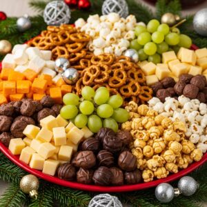 Set up a board for Christmas movie night! Include popcorn, candy canes, chocolate pieces, and caramel corn.
