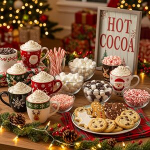 Include mugs of hot chocolate and toppings like mini marshmallows, chocolate chips, whipped cream, peppermint sticks, and sprinkles.