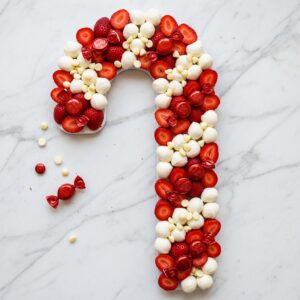 Make a candy cane–shaped board using alternating rows of strawberries and mini mozzarella balls.