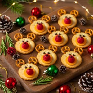 Use mini pretzels for antlers, round crackers with cheese slices for faces, and small cherry tomatoes or raspberries for Rudolph’s red nose.